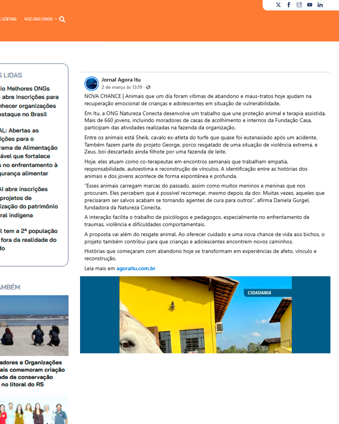 Desta vez, a iniciativa foi destaque em novas reportagens publicadas pelos portais Observatório do Terceiro Setor e Agora Itu, que abordaram o impacto da terapia assistida por animais no desenvolvimento emocional de crianças e adolescentes em situação de vulnerabilidade.